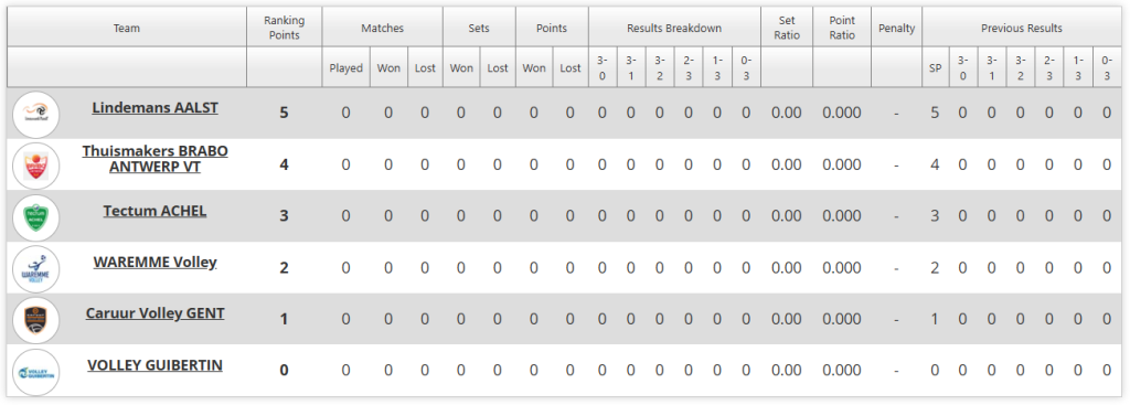 Pour cette deuxième phase, le nombre de victoires et le set average est remis à zéro. Donc si, par exemple, Anvers et Waremme sont à égalité à la fin de cette phase, ce sont les victoires qui rentreront en compte prioritairement et non les points acquis lors de la saison régulière.